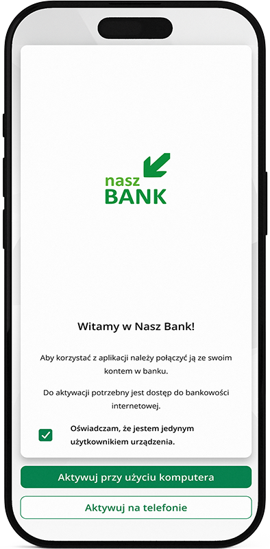 Pobierz aplikację Nasz Bank za darmo z oficjalnych sklepów – AppStore (dla iPhone’a) lub Google Play (dla telefonu z Androidem) i zainstaluj na swoim telefonie.