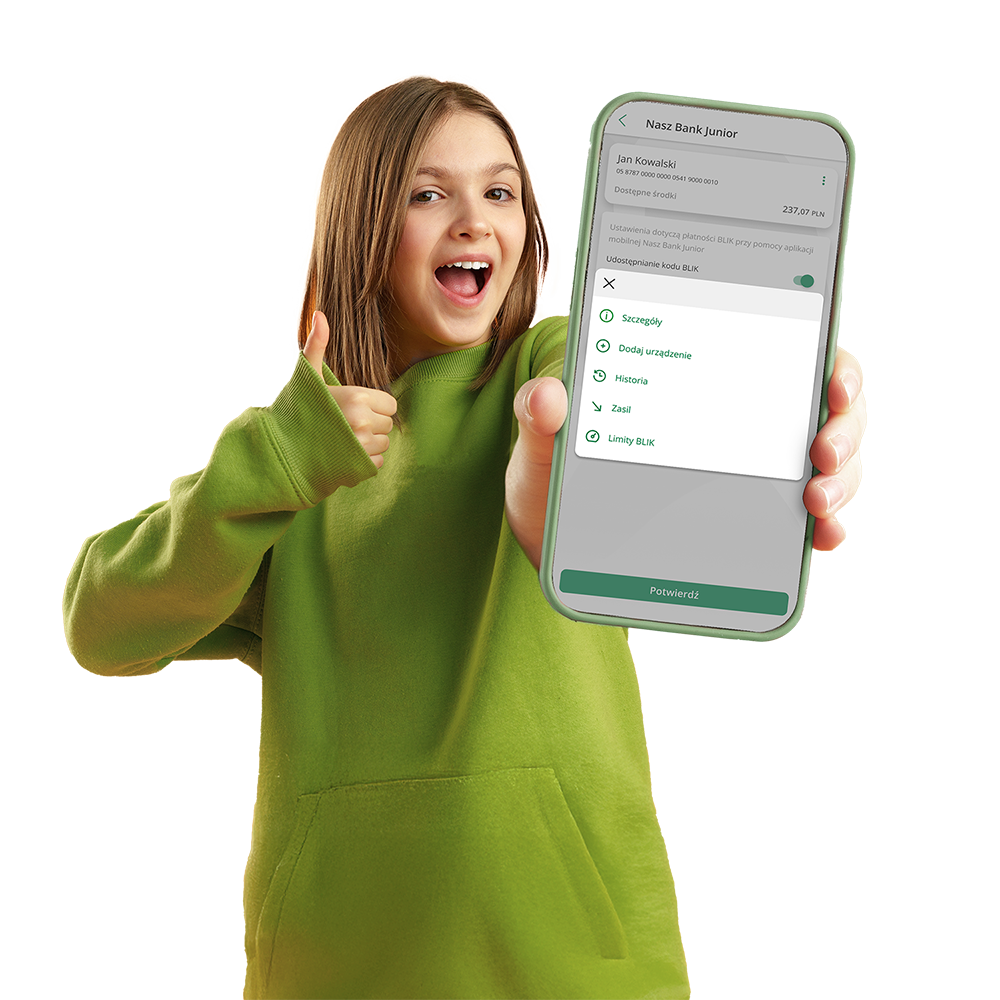 Możesz połączyć swoje konto z aplikacją Nasz Bank Junior i rachunkiem dziecka, by w każdej chwili zasilić je przelewem lub wysłać kod BLIK. Dzięki temu Twoje dziecko ma dostęp do własnych środków, może uczyć się oszczędzania i realizować swoje pierwsze transakcje pod Twoim nadzorem.